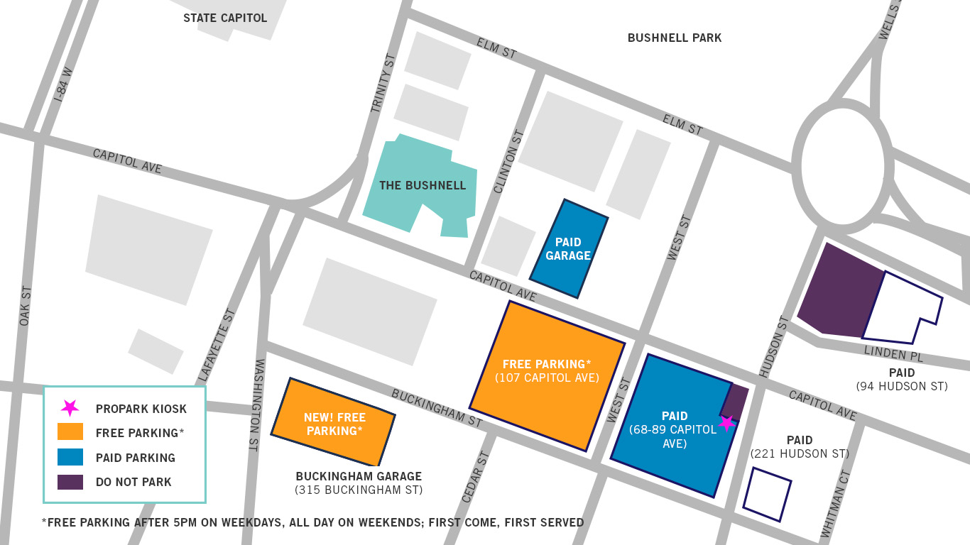 We're proud to offer free parking for our patrons in the State of Connecticut parking lot along Capitol Avenue and at Buckingham Garage on the corner of Buckingham Street and Washington Street. The Buckingham Garage opens two hours before weekday evening performances and performances on Saturday and Sunday. The garage will close one hour after the end of the performance. Accessible parking is available in these lots. Free spaces are available on a first-come, first-served basis.